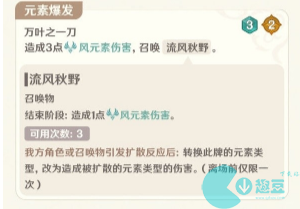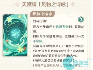 装备有此牌的枫原万叶引发扩散反应后:使我方角色和召唤物接下来2次所造成的被扩散元素类型的伤害 1。(每种元素类型分别计算次数)