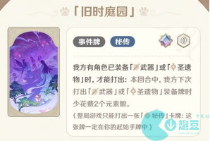 我方有角色已装备「武器」或「个圣遗物」时,才能打出:本回合中,我方下次打出「罗武器」或「伞圣遗物」装备牌时少花费2个元素骰。(整局游戏只能打出一张「秘传」卡牌:这张牌**在你的起始手牌中);