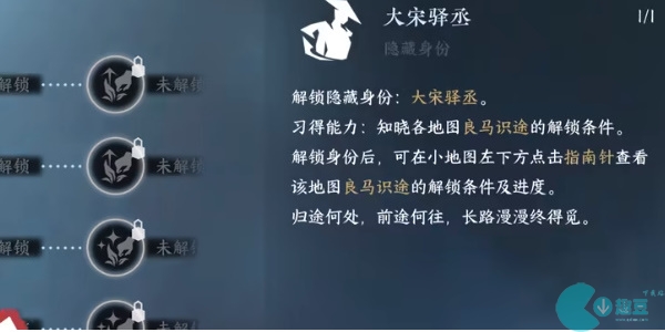 3、采摘完成之后,我们提交任务,然后就可以完成奇遇任务【良马识途】了,然后我们点击身份我们就可以看到大宋驿丞这个技能,之后我们做任务就可以自动寻路了;