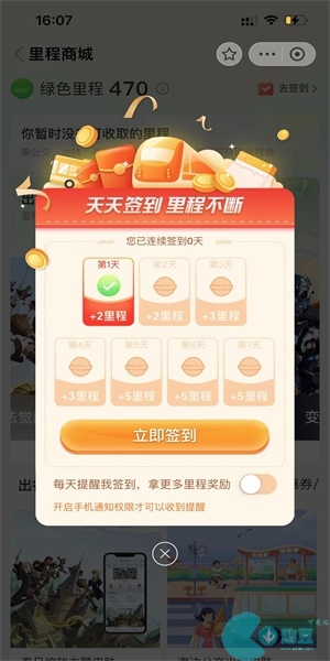 4、我们可以在里程商城里面进行每日签到。来获取到更多的里程来进行兑换。