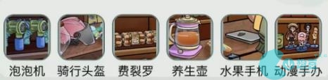 2、接着我们可以在画面上找到泡泡机、骑行头盔、费裂罗、**壶、水果手机等都不属于80年代的答案。