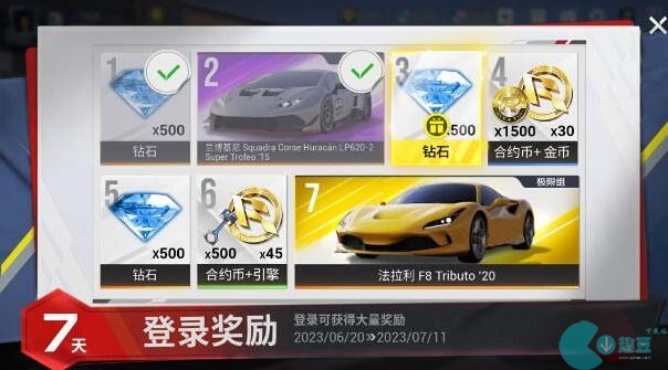 2、新手7天签到可以获得1500钻石奖励以及兰博基尼和法拉利F8。
