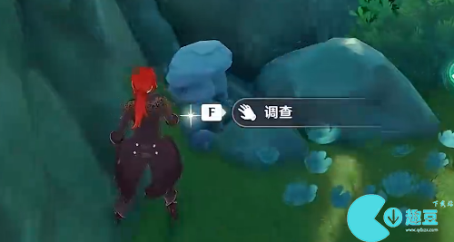 3、然后在刚才拿到摩拉的地方继续往前走,会穿过一个大洞,会看见石桌和石凳,桌子上还有茶水,收集点就在那个石桌后面的岩石下面,跳下去就可以了。