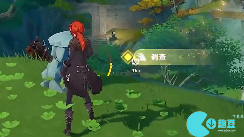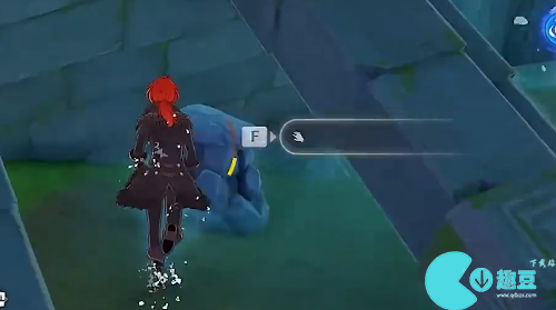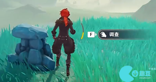 2、接着我们从山坡上跳下去,会看见一个小门,进小门之后,面前树枝旁边的石头就是摩拉收集点。