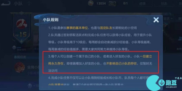 我们进入小队界面后,点击左上角的【?】标记,打开小队的规则,从中我们可以了解到小队在创建后是哦不可以解散的,但玩家可以退出小队。