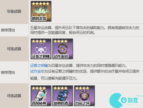 总结:鹤鸣余音是五星**武器,提升闲云队下落攻击的辅助能力。拥有高基础攻击力的同时提供**能量回复,契合闲云的机制。证誓之明瞳为四星**武器,提供攻击力的同时增强循环能力。试作金珀为没有证誓之明瞳时的优选,提供额外的**量并给闲云提供能量,可以缓解充能循环压力。