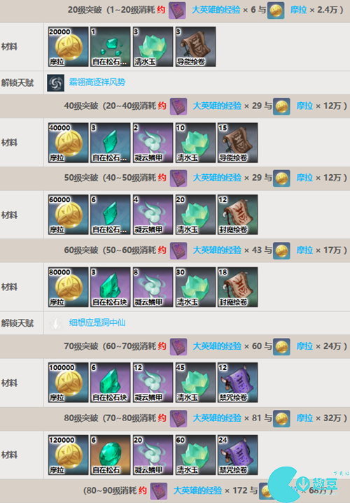 80级突破所需:摩拉×120000、自在松石×6、未熟之玉×20、清心×60、原素花蜜×24。