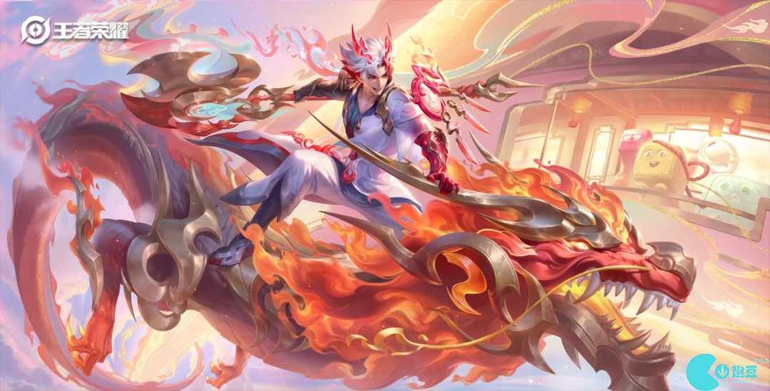 他矫健身姿乘于神龙之上,烈焰燃烧、祥云环绕,锋利战斧噼开前路,神龙以威武之姿昂首向前,百态之灵亦在龙车内与他共赴未来。