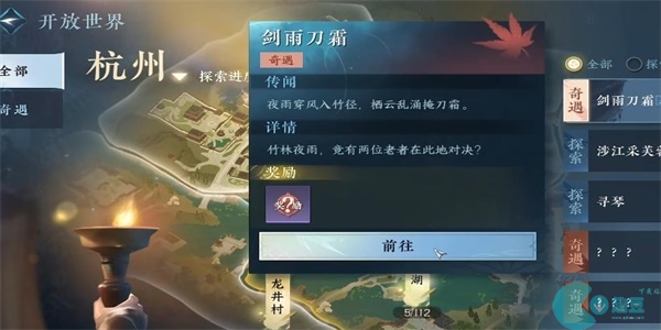 1、首先我们需要前往杭州【697,1184】的位置,完成剑雨刀霜探索。