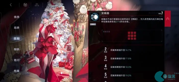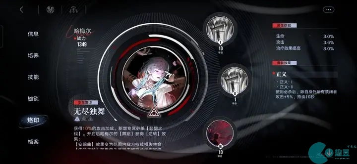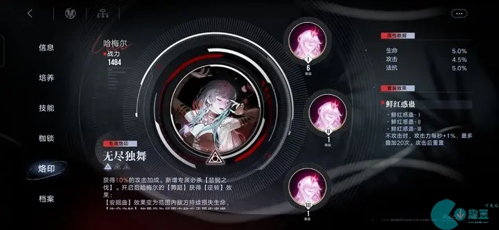 哈梅尔奶量受攻击力影响,但她本身不攻击,所以鲜红惑蛊非常适合。一般新手没开专只奶人的话,终幕之序章(奶烙)更好用也更容易获得,但是开专后奶烙的奶量加成无法被加成转化的伤害,鲜红因为是通过提升面板来着增加奶量所以提升的奶量可以被转化成伤害。高练开专后站得住的话,可以带正义套装和终幕3散件,用哈梅尔可以**开关专烙奶伤转换来触发正义的全员攻击力加成。或者一号位随便散件+复乐园当做破核工具人。