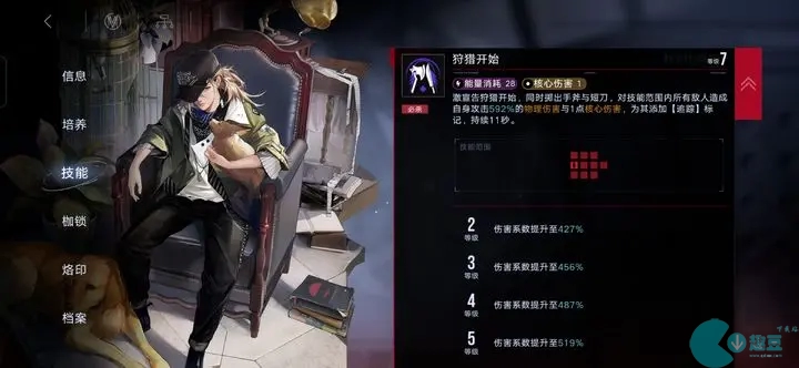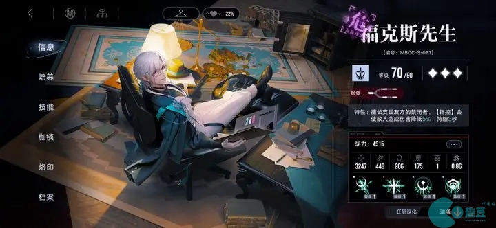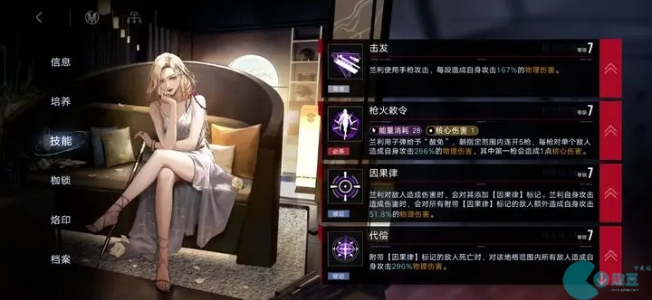 2. 兰利:当前环境**精准系,半群伤射手。高攻高破防,通用性很广,也不吃枷锁。0锁能上场1锁就质变,但是也有大多数射手的通病,不具备高爆发。枷锁1和开专后对群总体增增伤效果很明显。大招范围内有多个核心怪的话兰利会优先破核核心多的怪。前期技能点点普攻和被动一因果律发射器就行了,输出不低,但主要还是一个功能性。
