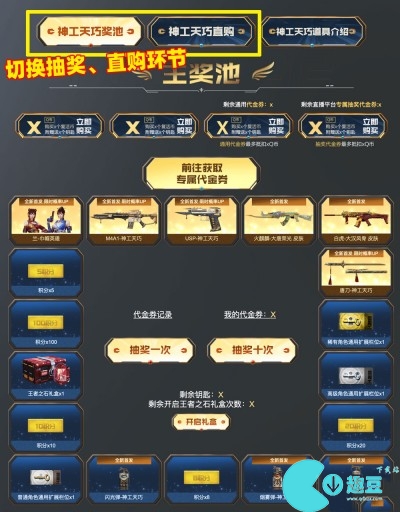 1、神工天巧奖池转盘,可抽到M4A1-神工天巧、USP-神工天巧、神工天巧投掷道具等武器道具;