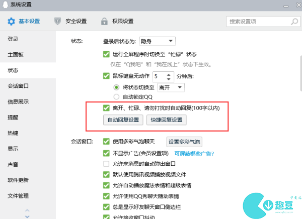 5、如图,在“离开、忙碌、请勿打扰时自动回复”前面打勾,还可以设置自动回复、快捷回复的内容。