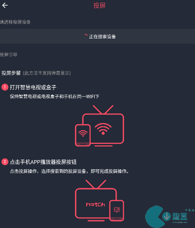 4、然后软件自动搜索你需要投屏的电视,但是一些用户的软件搜索不到自己家的电视,可能你家的电视连接的无线网和手机连接的无线网不是同一个,需要是统一的无线网下面才可以投屏哦。