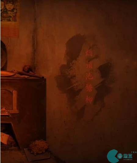 1、灶台左下角找到碎瓷片,用碎片刮右墙会出现“烟锁池塘柳”,这句诗偏旁对应五行,得到线索【火金水土木】