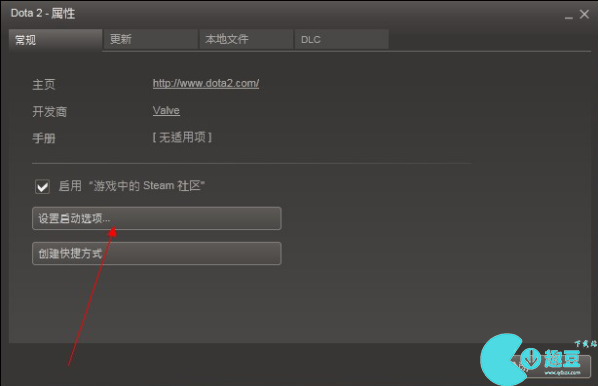 2、然后会进入DOTA2的属性界面,在常规里面点击设置启动选项;