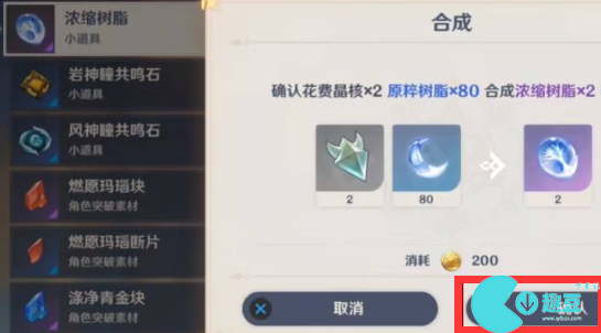 3、2个浓缩树脂需要花费晶核×2和原粹树脂*80,玩家点击确认即可合成。