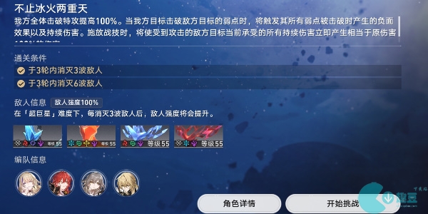 这个关卡我们的击破弱点达到了百分百所以我们使用普攻也是可以进行急迫的,但是我们需要吧大招流到3-6-9波,期间我们用希露瓦加姬子就可以度过每个关卡的前面两拨小怪,后面我们直接对中间的怪物开大即可;