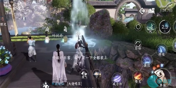 2、接着我们就到达任务地点,与师兄进行对话,使用水的技能,把所以的罐子装满水。