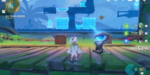 5、对话结束后,我们需要进行一个简单的解谜,首先我们需要推动木台上的木箱,之后使用旁边的聚流映灯,进入先成图,开启宝箱后,我们就可以离开先成图;