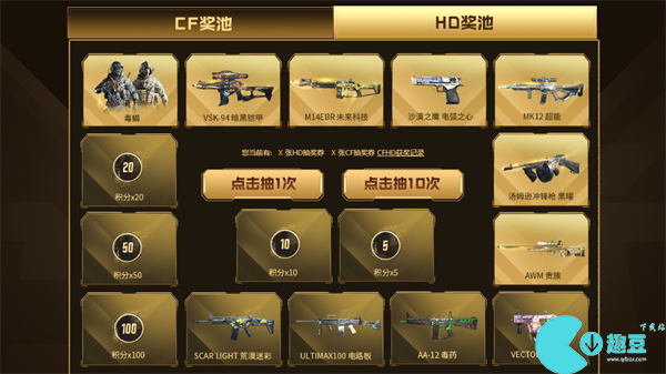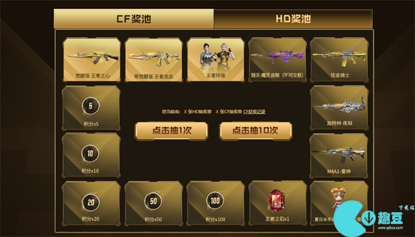 4、在目前的**活动中,玩家可在CF奖池、HD奖池中自由选择抽取,每个奖池的奖励不同;