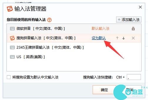 4、进入后,找到搜狗输入法那一栏,点击“设为默认”并“确定”保存。