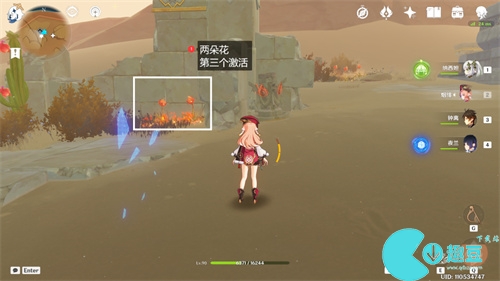 6、第四个火元素方碑周围空地上有三朵烈焰花。激活后越过秘境就能看见四朵烈焰花的第五