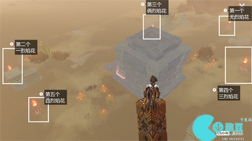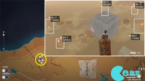 2、此解密需要按烈焰花顺序激活火元素方碑,也就是从没有烈焰花,一个,两个这样顺序依次激活,下图为总览。