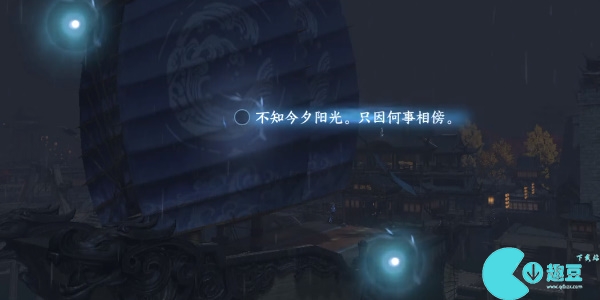 3、继续随镜头移动到船的左上角我们选择中间出现的光点作词写出第二句(不知今夕阳光,只知何事相傍。)。