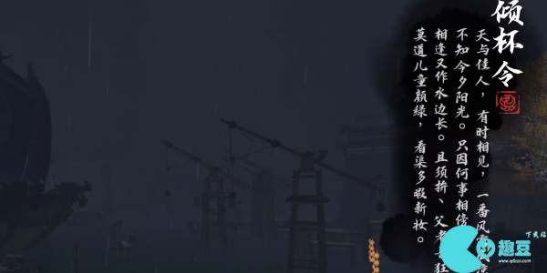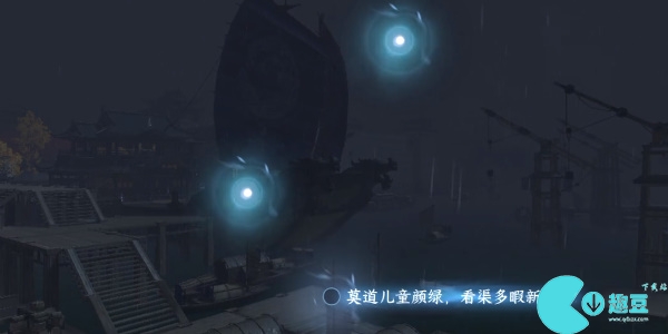 5、继续随游戏镜头移动看到整个码头这时我们选择下面出现的光点作出**一句词(莫道儿童颜绿,看渠多暇新妆。)。