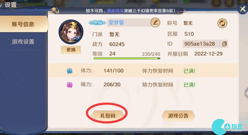 3、我们在账号信息页面,就可以看见【礼包码】的功能选项,点击进入。