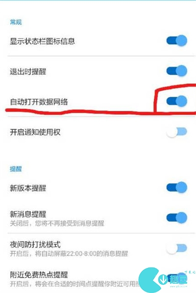 当我们金UR应用的设置之后,然后我们找到自动打开数据网络的功能,点击右侧的滑块开启即可。