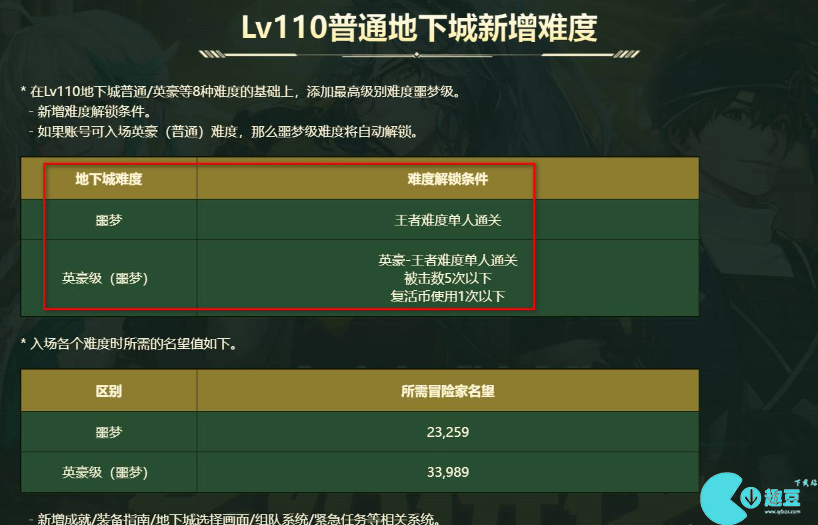 地狱级难度即噩梦难度。普通噩梦难度要求王者难度单人通关即可开启,英豪级(噩梦)要求:英豪-王者难度单人通关;被击数5次以下;复活币使用1次以下。普通噩梦难度要求名望值23259,英豪级(噩梦)要求33989。