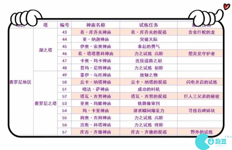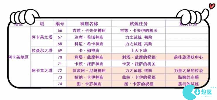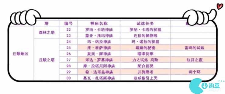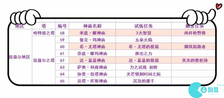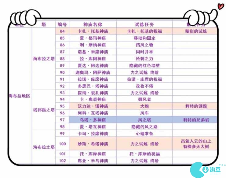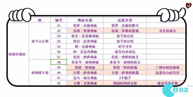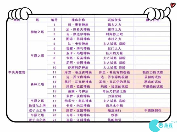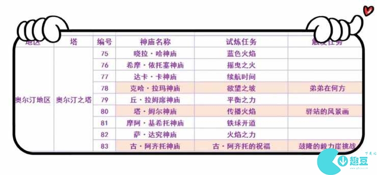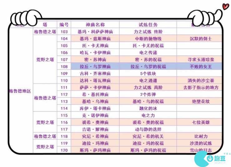 PS:表格中有颜色标记的是隐藏神庙。其中乌塔·多神庙,需要解救风神兽后触发任务才能解锁,拉丘·乌罗神庙需要解救雷神兽后触发任务才能解锁。