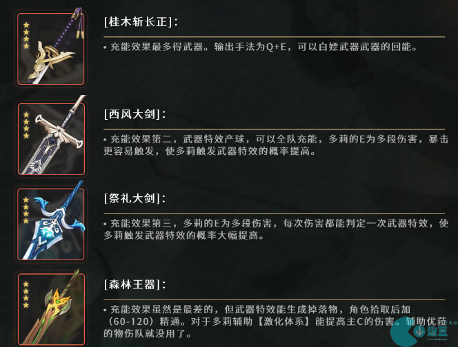 森林王器:虽然充能差,但是拾取掉落物可以增加精通,对于激化体系很好用。