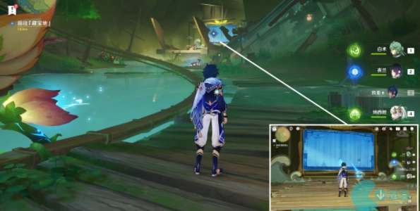 6、完成挑战之后。我们返回喇叭处,发射**击碎石壁,跟着任务指引,深入洞窟,前往藏宝地;