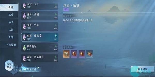 1、首先我们需要达到**43级,才可以接取到庄园任务,接着我们就子啊**里面找到【庄园地契】的任务。