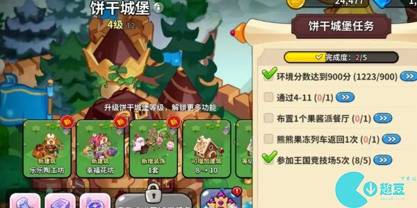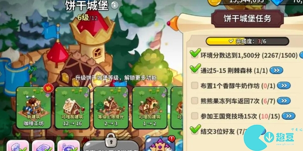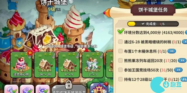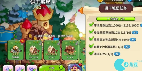 当玩家的环境分数达到1000分、参加王国竞技场10次、熊熊果冻列车返回4次、布置1个幸福花坊、通过4-25,然后消耗一些材料就可以将饼干城堡升级到6级。