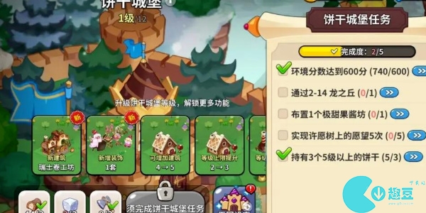玩家只要环境分数达到600分、通过2-14龙之丘、布置1个极甜果酱坊、实现许愿树上的愿望5次、持有3个5级以上的饼干;达到以上条件并消耗一些材料就可以将饼干城堡升级到2级。