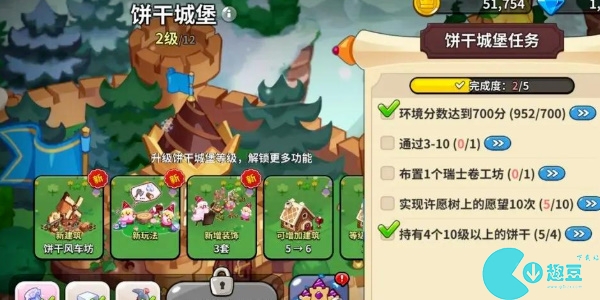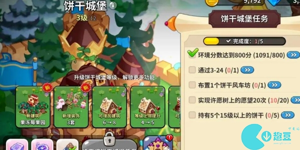 环境分数达到800分、通过3-24、布置1个饼干风车坊、实现许愿树上的愿望20次、持有5个15级以上的饼干。达到以上条件消耗一些材料就可以将饼干城堡升级到4级。