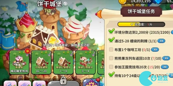 环境分数达到2200分、参加王国竞技场20次、熊熊果冻列车返回10次、布置1个咖啡工坊、通过5-28缠绕的荆棘、持有10个24级以上的饼干。