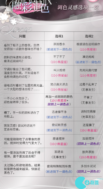 答案:①不了不了——10小能星座;②凑近闻闻——前进到下一调色点。