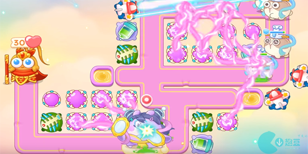 3、第四波,(第三波基本上清图完毕了我们在左下和右上**放置魔法球,有金币就升级就可以了)雷公出来了,我们需要先锁定一下神仙,然后注意它释放的道具我们需要及时清理;