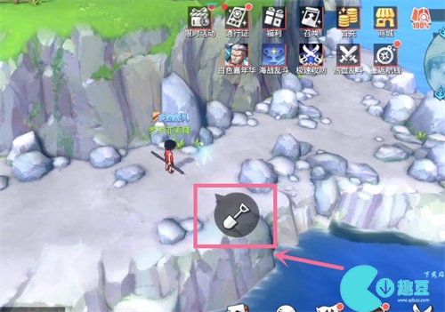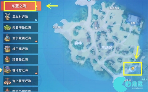 大家根据提示,来到”布满碎石的灰白海岸“,也就是东蓝之海地图糖汁村右下角的位置,如图所示。