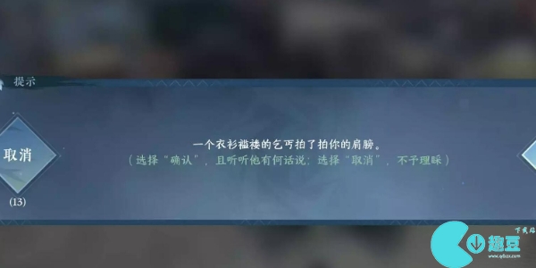 第五步:这时候会有一个乞丐过来拍玩家的肩膀之后进行对话他要啥就给啥,对话结束后就会触发加入丐帮的奇遇任务 ;