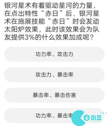 问题4、银河星术有着驱动星河的力量在点出特性“赤日”后,银河星术在施展技能“赤日”时会发动太阳炉效果,此时该效果会为队友提供3%的什么效果加成呢?