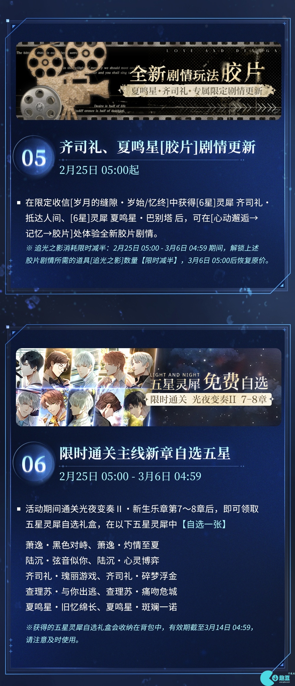 2月25日 05:00起,光夜变奏Ⅱ・新生乐章第7~8章全两章剧情更新,通关全新两个章节可领取五星灵犀自选礼盒。齐司礼、夏鸣星专属【胶片】剧情也将于2月25日更新,在限定收信 [岁月的缝隙·岁始/忆终] 中获得 [6星]灵犀 齐司礼抵达人间、[6星]灵犀夏鸣星·巴别塔 后,可在[心动邂逅→记忆→胶片]处体验全新胶片剧情。