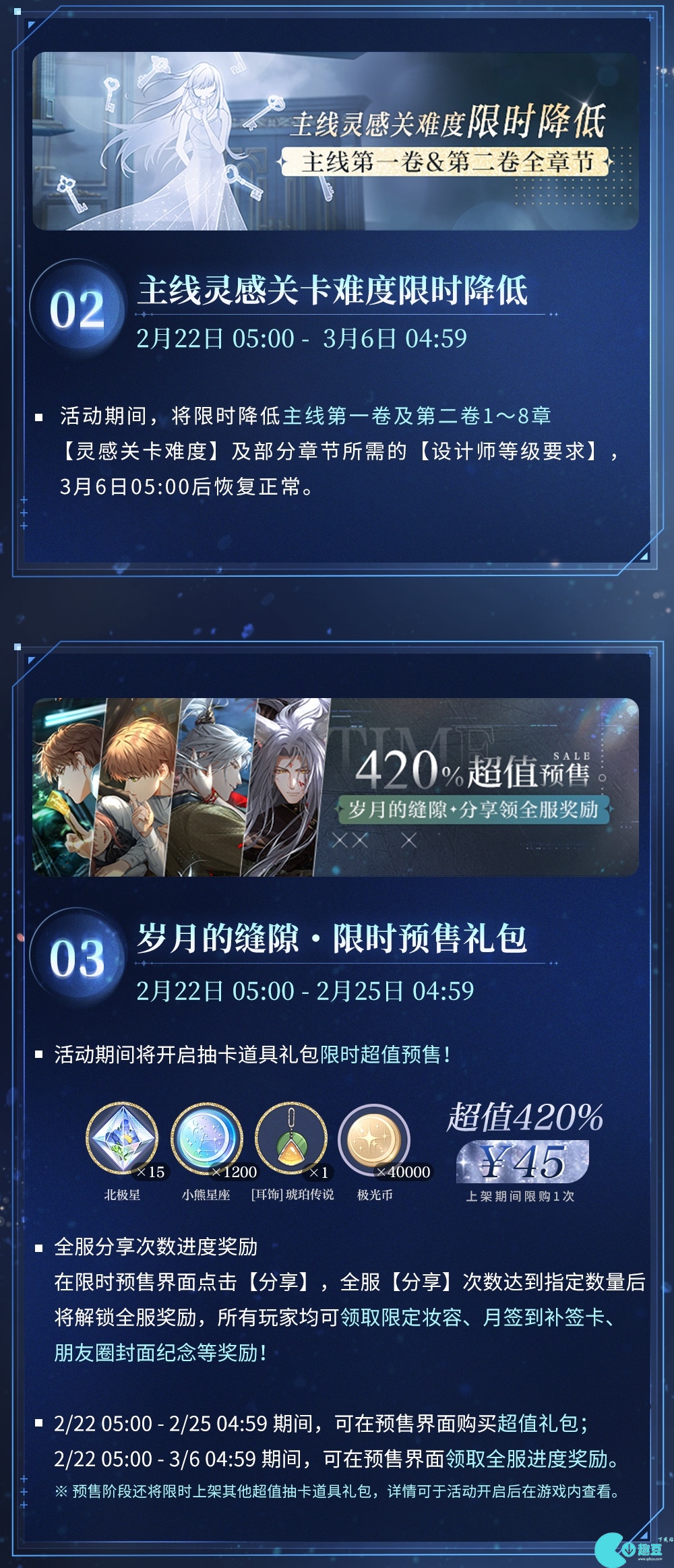 2月22日 05:00起,主线**卷和第二卷1~8章【灵感关卡难度】及部分章节所需的【设计师**要求】将限时**,3月6日05:00后恢复正常;岁月的缝隙·限时预售礼包活动开启,在限时预售界面点击【分享】,全服【分享】次数达到指定数量还可领取限定妆容、月签到补签卡、朋友圈纪念封面等全服奖励。