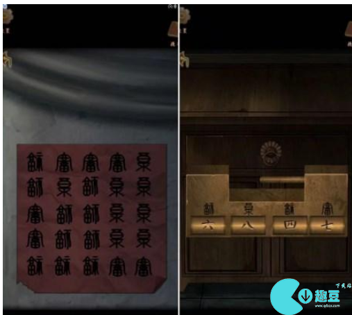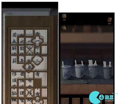13.屏风后面结合挂字信息摆放桌前字画筒数量打开窗户得到抽屉拉环,安装在左边书柜抽屉上拉开得到印章,蓖麻油和朱砂粉倒入书桌上砚台,用印章得到蘸了印泥的印章,盖在字上得到铜钥匙,打开右边暗室。