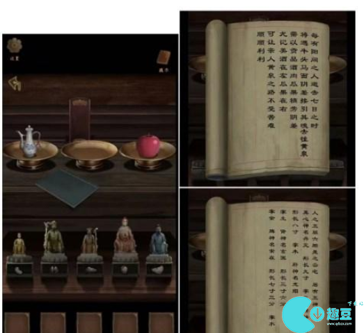 3.灵堂,墙上红纸信息打开柜子上密码锁得到空酒壶和五神人偶。